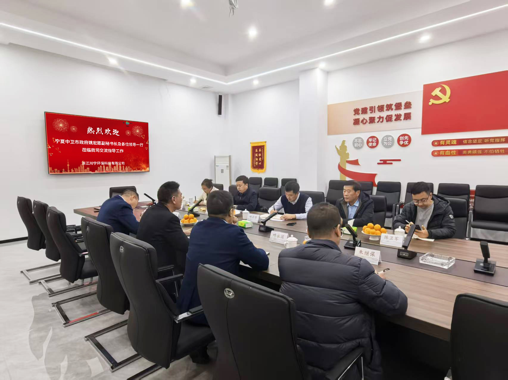 2025年12月10日,由宁夏中卫市政府副秘书长姚宏愿带队,工业园区党工委委员李广强,市生态环境局副局长李玉明,市财政局调研员李衍萍,工业园区管委会财政金融局局长陈卫军,工业园区管委会综合服务局干部马红霞等组成的政府考察团,专程莅临我司进行考察调研。此行旨在深入了解我司在环保科技领域的创新成果与运营模式,共商合作大计,共绘发展蓝图。我司总经理邵永富携核心管理团队热情接待,双方举行了座谈交流会。