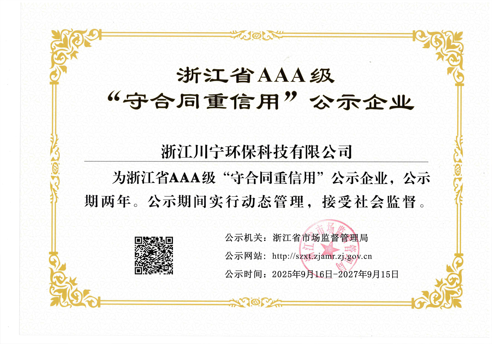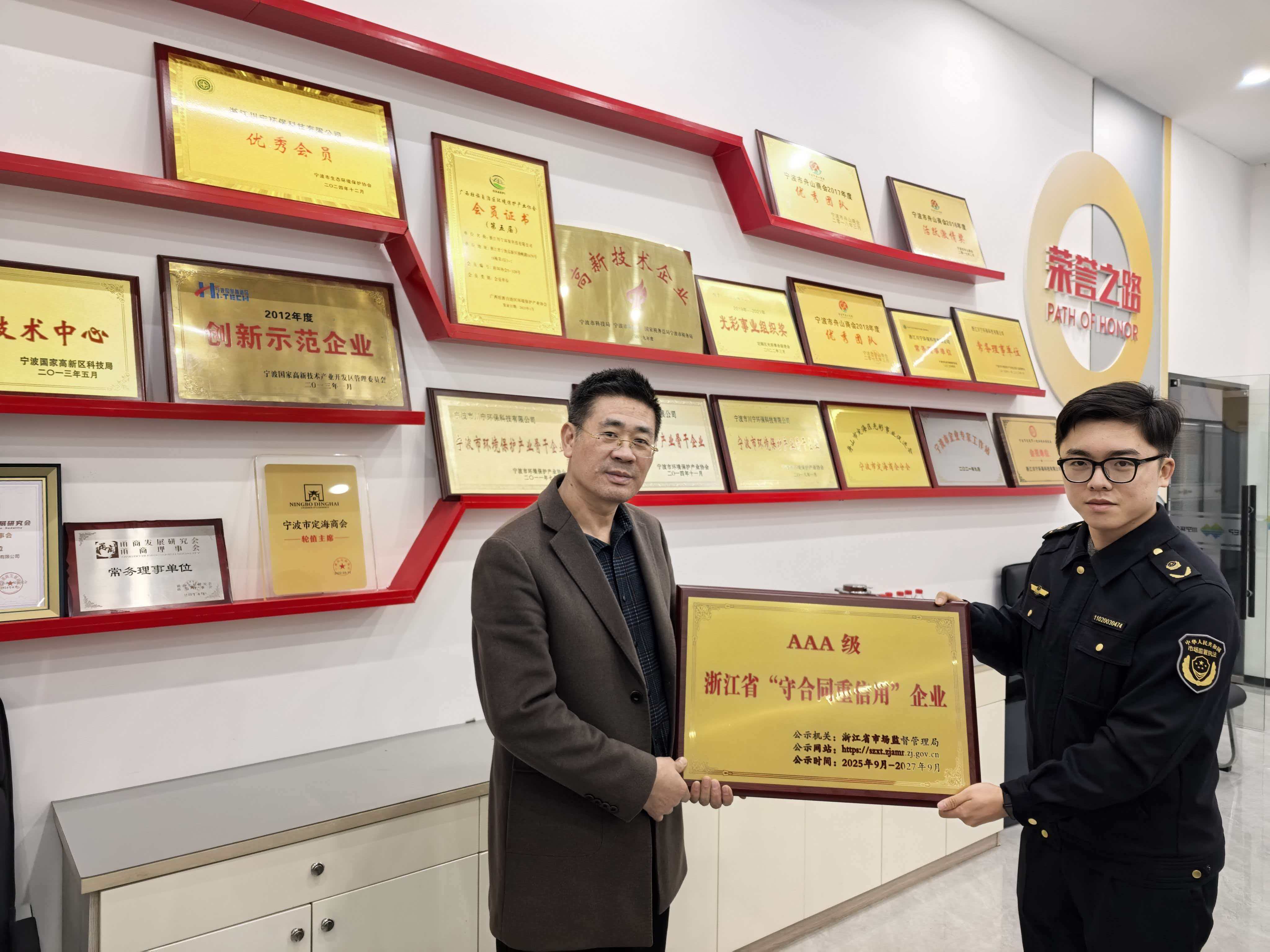 12月24日,宁波市高新区市场监督管理局领导莅临浙江川宁环保科技有限公司,向我司颁发—浙江省AAA级“守合同重信用”荣誉牌匾。
